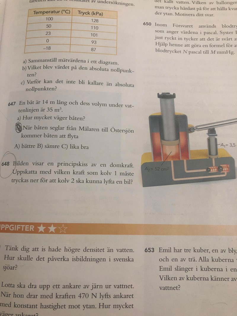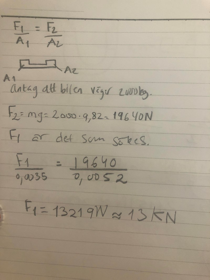 Jag uppskattar att bilen som läggs ovan på kolv 2 väger 3500kg. Jag räknar med att trycket på kolv 1 blir mg=3500*9.82=34 370N