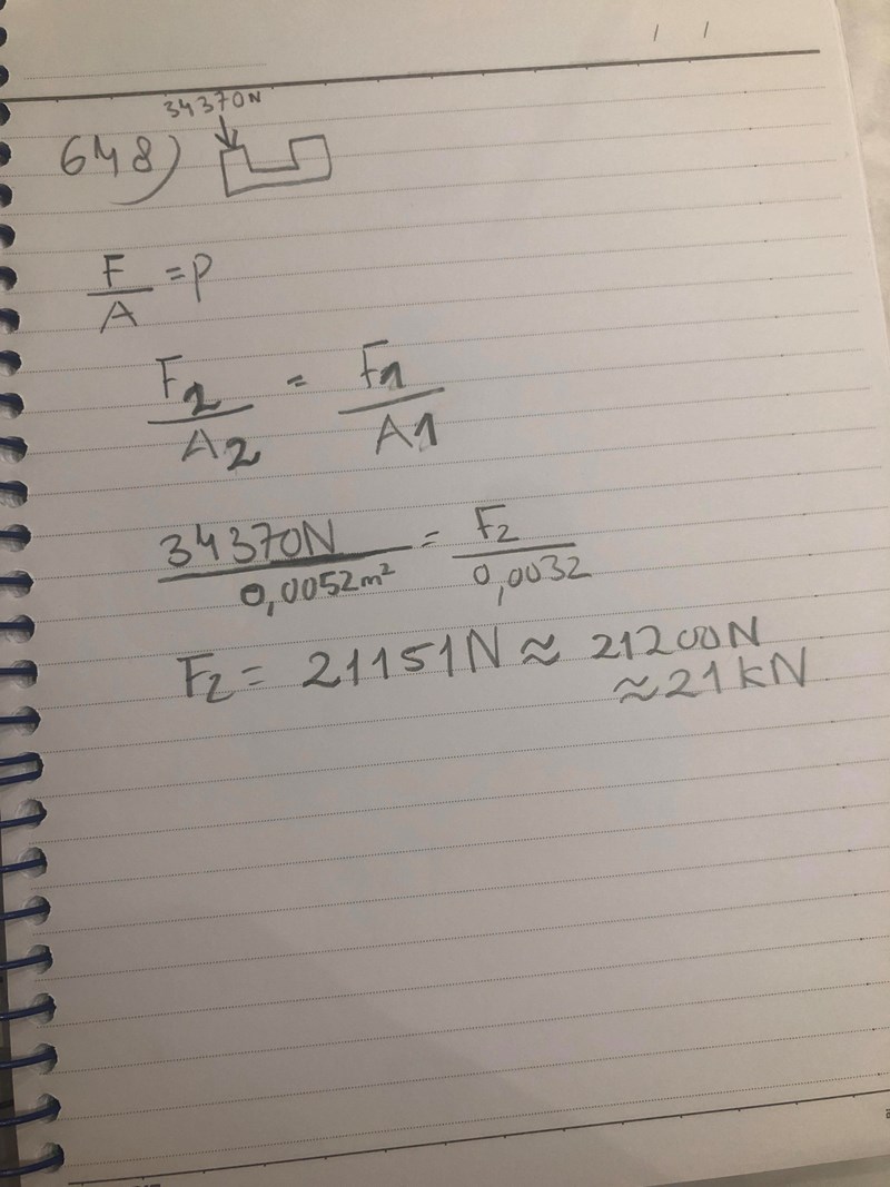 Du skriver att TRYCKET på kolv1 är 34...kN. Det är fel. Däremot är KRAFTEN (F2) på kolv2 34...kN.
