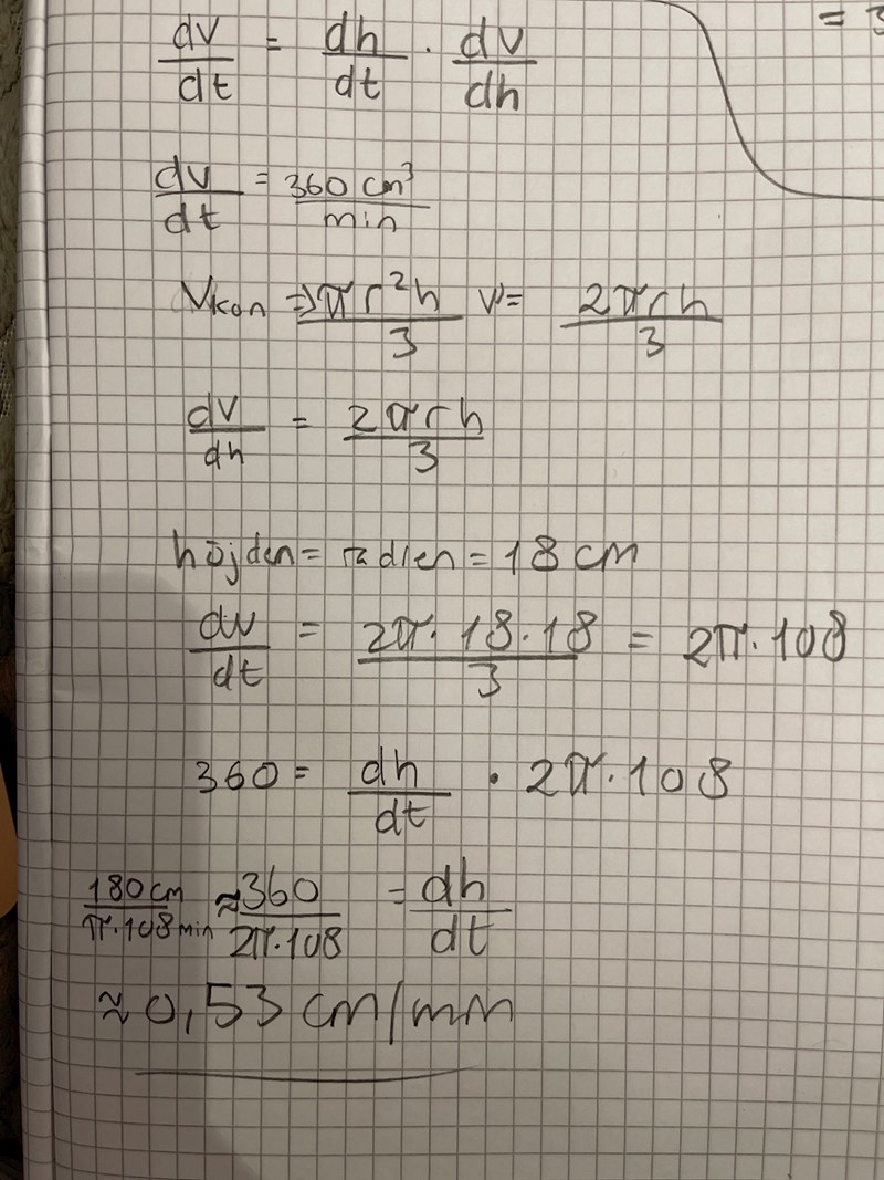 Du har glömt att r = h när du beräknar vkon och alltså blir dv/dt fel (den är felderiverad som det står också).