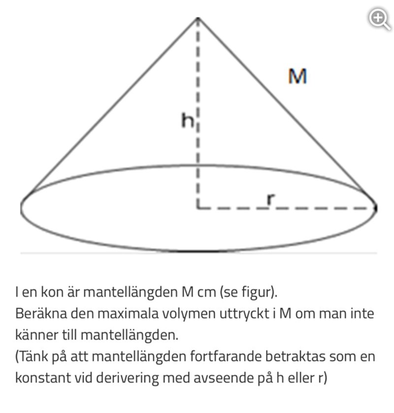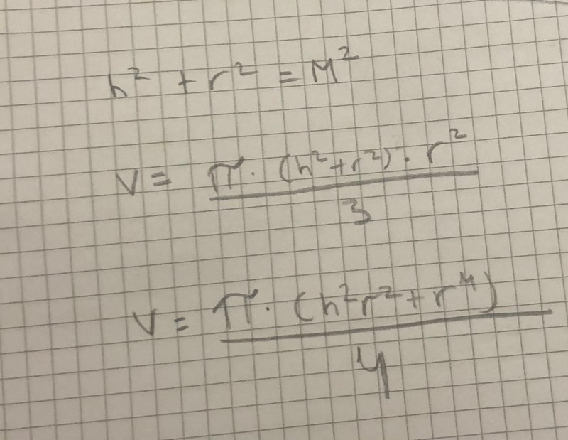 Visa hur du går från V=πr2h3V=\frac{\pi r^2h}{3} till V=π(h2+r2)·r23V=\frac{\pi (h^2+r^2)\cdot r^2}{3}