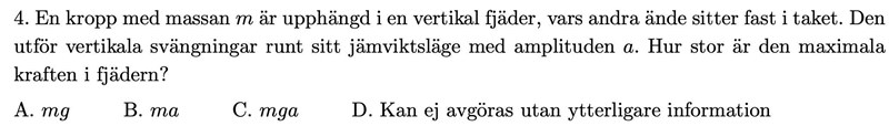 I jämviktsläget så är fjäderkraften lika med tyngdkraften mg. Sedan sträcks fjädern maximalt ut ytterligare a längdenheter så fjäderkraften ökar med ka. Så den maximala fjäderkraften blir mg + ka. Så rätt svar måste vara D.
