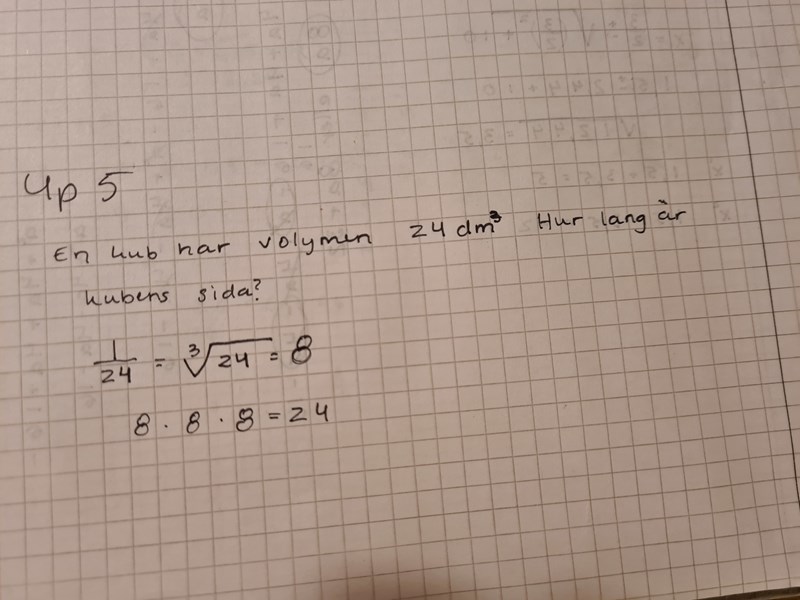 Tredje roten ur 24 är rätt tänkt. Men vad får du när du räknar ut 8 gånger 8 gånger 8? Inte blir det 24.