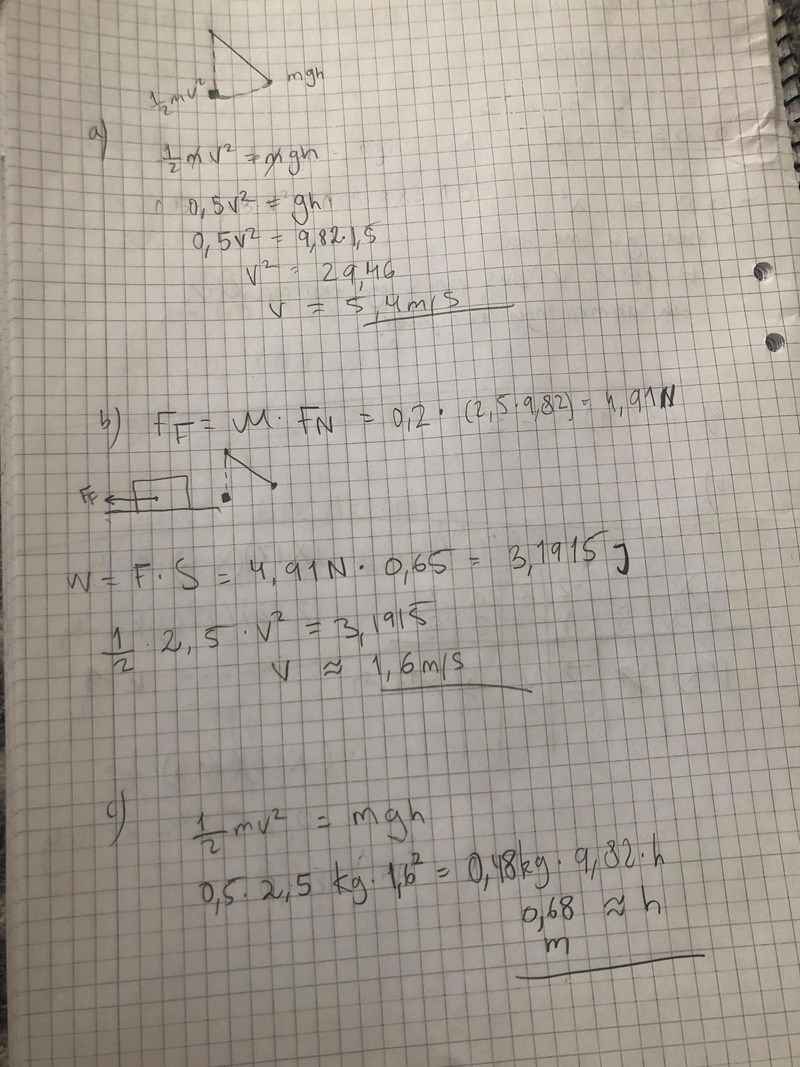 b) Klossen väger 2,5 kg. Klossen glider 0,65 m på golvet innan den stannar. Friktionskoeffcienten är 0,2. Vilken hastighet fick klossen vid sammanstötningen?