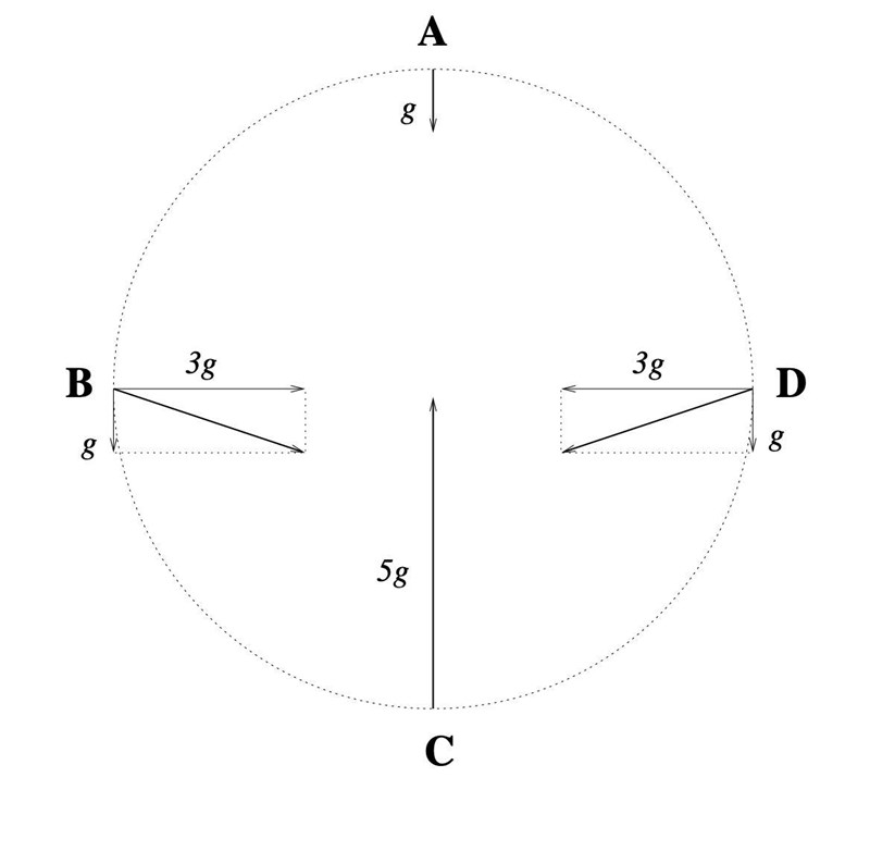 Är det så att centripetalaccelerationen är acceleration resultanten i C? För isåfall är ju det 6g uppåt och g neråt vilket gör resultanten till 5g. Annars är det skumt att dem inte skrivit ut g.
