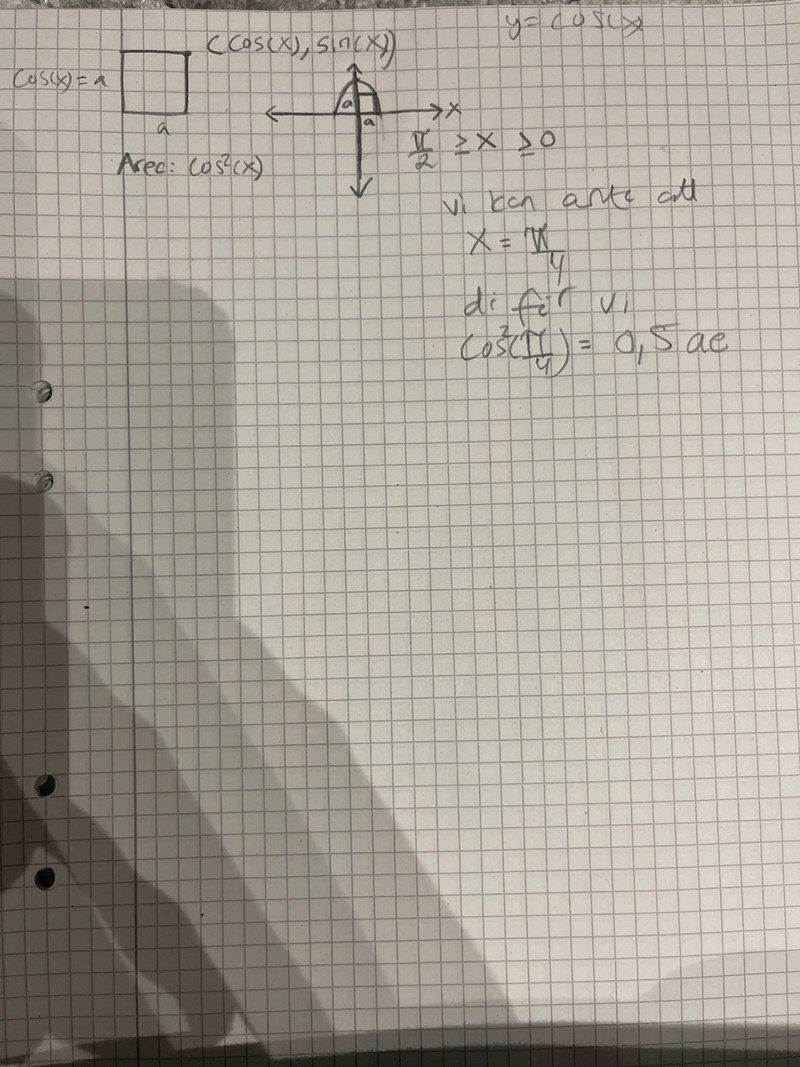 Ena sidan på din kvadrat är cos(x) (höjden / funktionsvärdet) medans en annan sida typ botten har längd x (bredden).