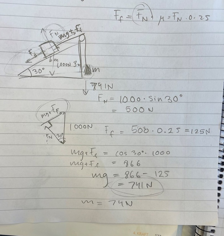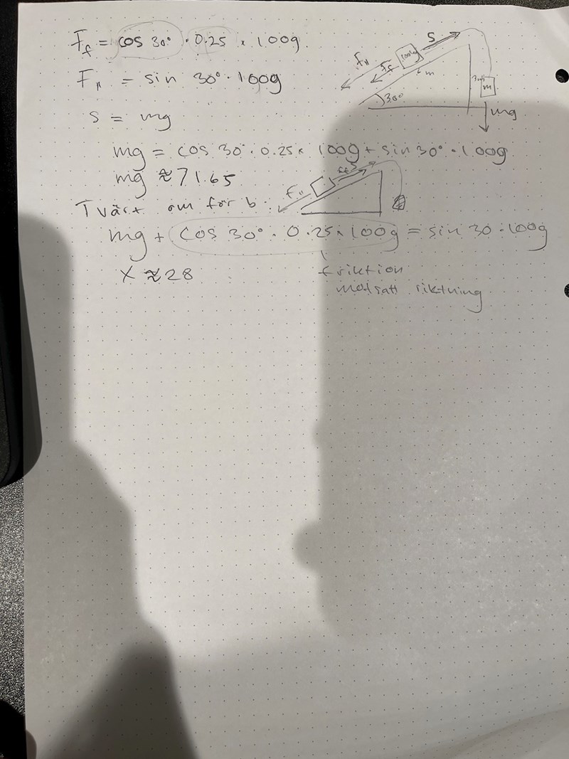 Varför får jag rätt med mg+Ff=cos 30* 1000