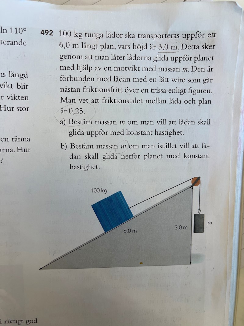 men förstår inte hur jag ska göra på b. Jag förstår inte hur någon kraft skulle förändras bara för att klossen rör sig nedåt. Den har ju konstant hastighet, så fres är 0. Jag tänker att klossens färdriktning bara beror på vilket håll den börjar färdas från då en 74 kg vikt skapar jämnvikt i systemet, men detta stämmer ju inte. Därför tänker jag att det måste vara någon kraft som byter riktning, men förstår verkligen inte vilken. Friktionen borde väll fortsätta vara uppåt även när klossen fördas nedåt? Eller? Vad är det som förändras när klossen fördas nedåt?