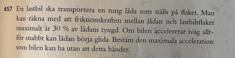 Friktionskraften är max 0,3*m*g om vi sätter det lika med m*a får vi för vilket värde på a som lådan precis inte börjar glida