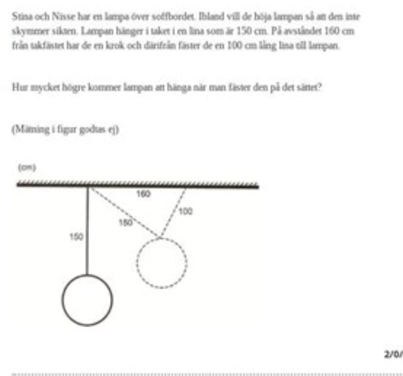 Beräkna arean av triangeln med sidorna 160-150-100. Beräkna höjden mot sidan 160 (med hjälp av arean). Klura vidare.
