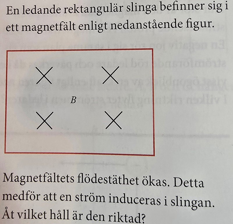 joculator skrev:Magnetfältet där slingan befinner sig är riktat in i papperet. Detta magnetfält ökas.