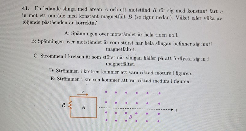 Jag valde E) pga lenz lag men hur avgör man om man strömmen i kretsen ökar eller minskar när den inducerar en spänning till följd av förändringen av B-fältet? B-fältet är ju konstant hela tiden. Men kan arean av slingan förändras ?