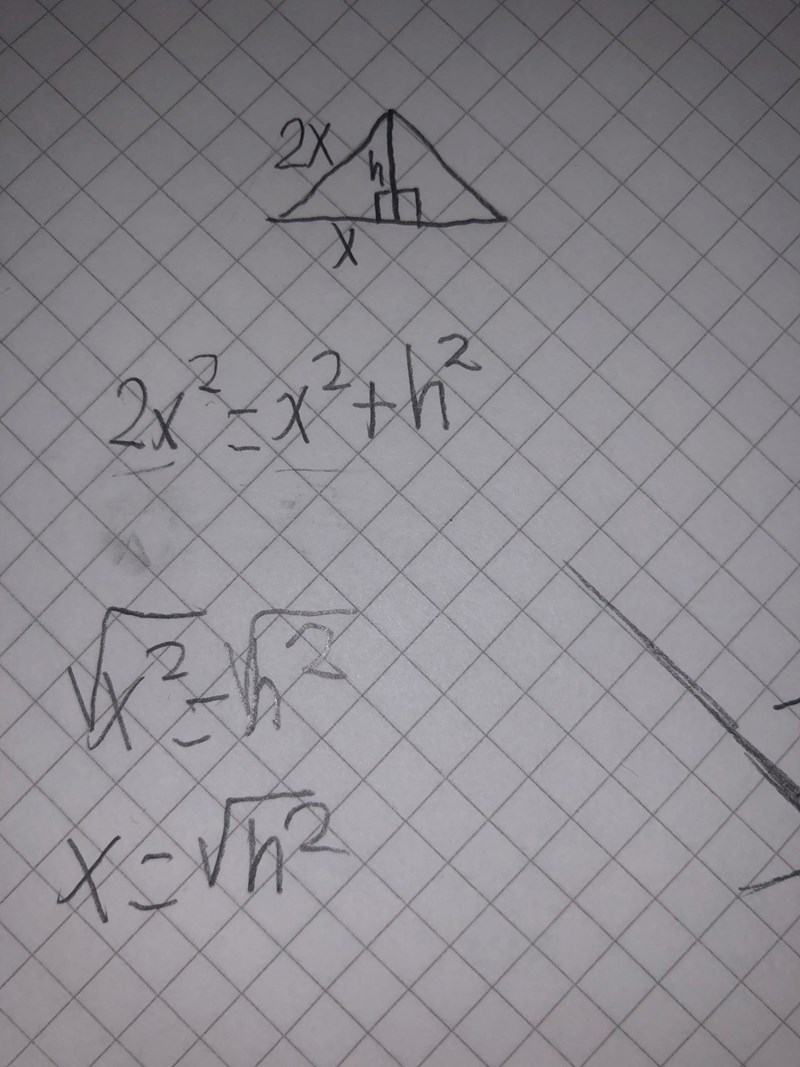 Rita in höjden i triangeln. Då får du två rätvinkliga trianglar. Basen är (t ex) x, höjden är h och hypotenusan är 2x. Använd Pythagoras sats för att få ett uttryck för h (som beror på x). Kommer du vidare?