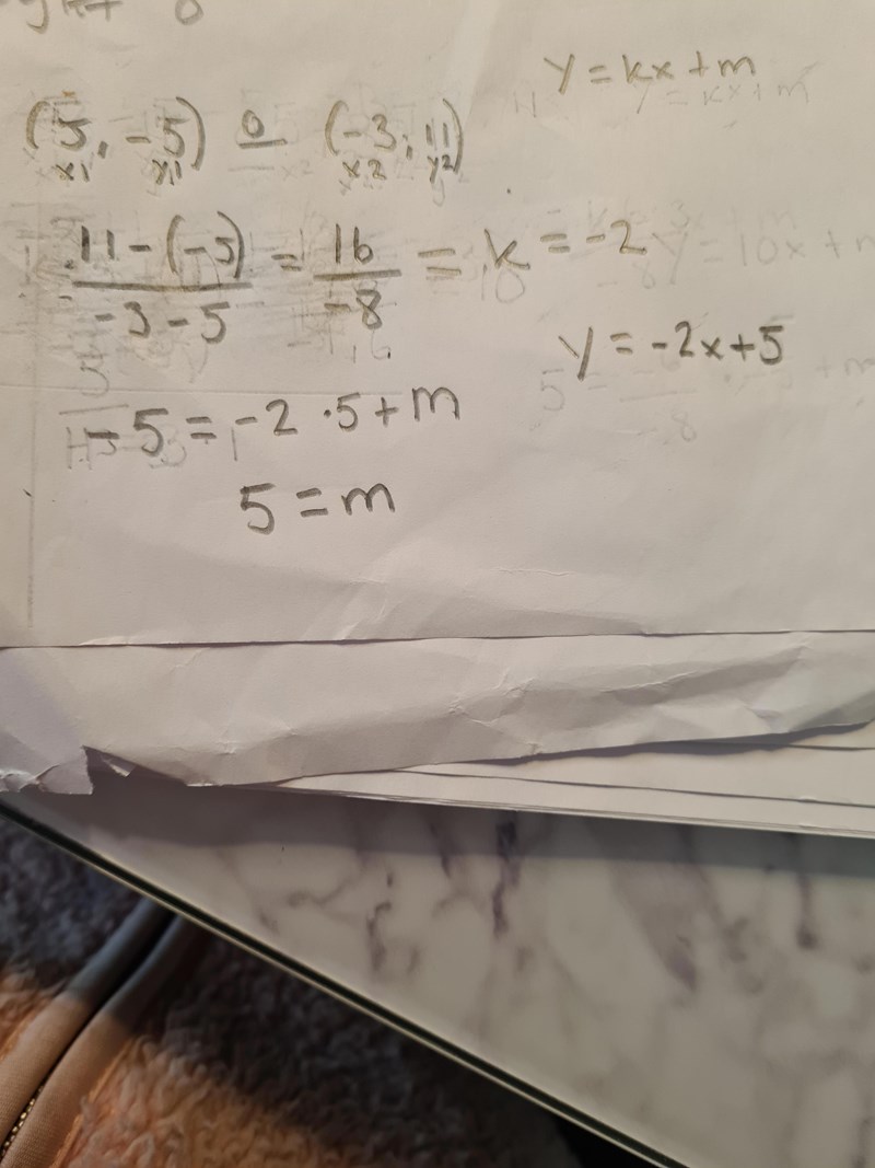 En linje går igenom punkterna (5,-5) och (-3,11).