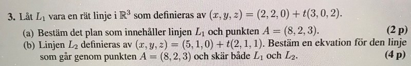 En linje ska skära plan, punkt, L1 och L2?