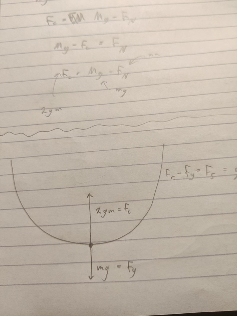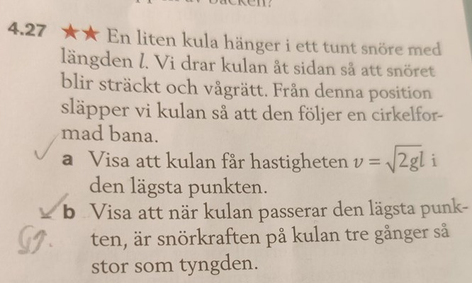 Ok. I uppgift a fick vi fram v vid den lägsta punkten. v=roten ut 2gl. mv2/r= centripetalkraften som är riktad uppåt. mg (Fg) är riktad nedåt. Om positiv kraft uppåt, så ger det att centripetalkraften (2gm) - gravitationskraften (gm) = resulterande kraft = snörkraften. Men detta stämmer uppenbart inte...