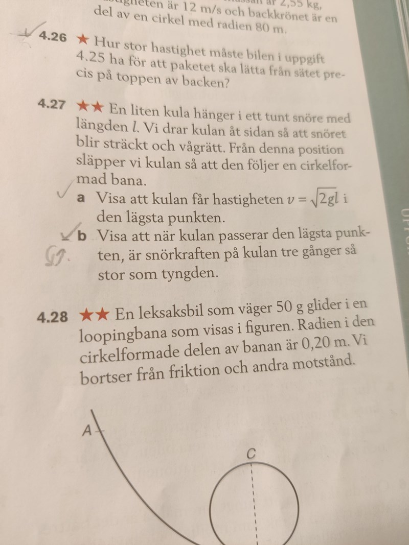 Jag har fastnat på en uppgift om centripetalkraft. 4.27 b. Min lösning kommer också. Fs är kraften i snöret. Varför stämmer inte mitt svar??