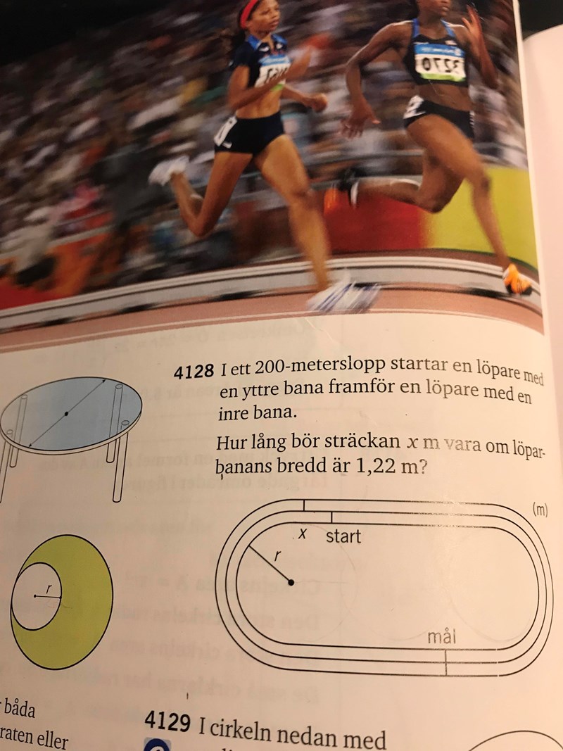 Svar: sträckan x bör vara m = 3,83 meter. Startstrecket för den inre banan bör vara 3,83 meter bakom den yttre banan.