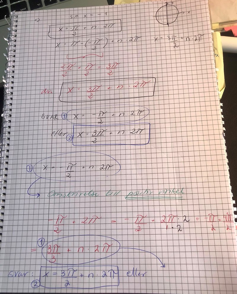 Om du vill förbättra din förståelse lite, försök hitta 3pi/2 på enhetscirkeln också. Som du har visat är 3pi/2 samma sak som -pi/2 + 2pi. Att addera 2pi betyder att du går ett helt varv runt cirkeln, så om du började med -pi/2 kommer du att hamna på samma plats på enhetscirkeln. Du kan också tänka att 3pi/2 = pi/2 + pi. Om 2pi är ett helt varv, så är pi bara ett halvt varv. Om du börjar med pi/2 och går ett halvt varv på cirkeln, så hamnar du igen på samma plats som -pi/2.