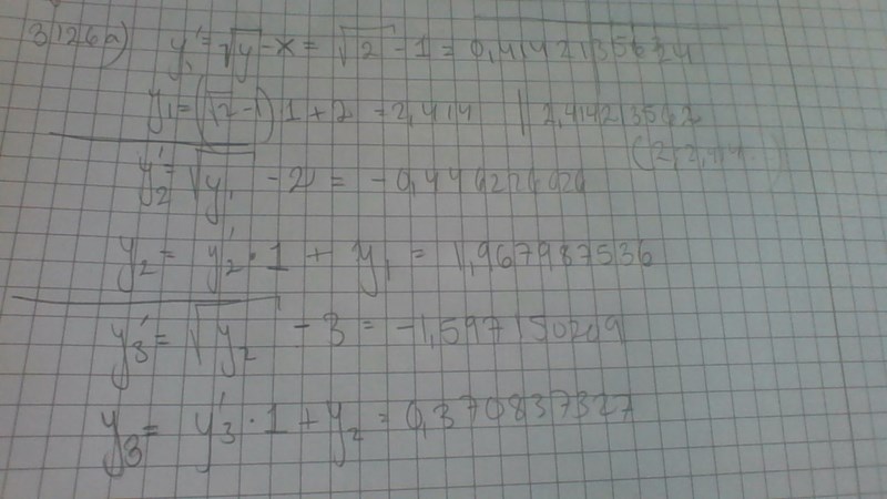 "En lösningskurva till y'=sqrt(y)-x går genom punkten (1,2). Uppskatta värdet av y(3) med hjälp av Eulers stegmetod och steglängden: a) h=1"