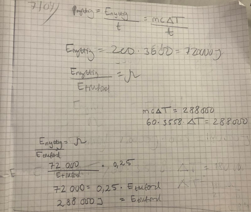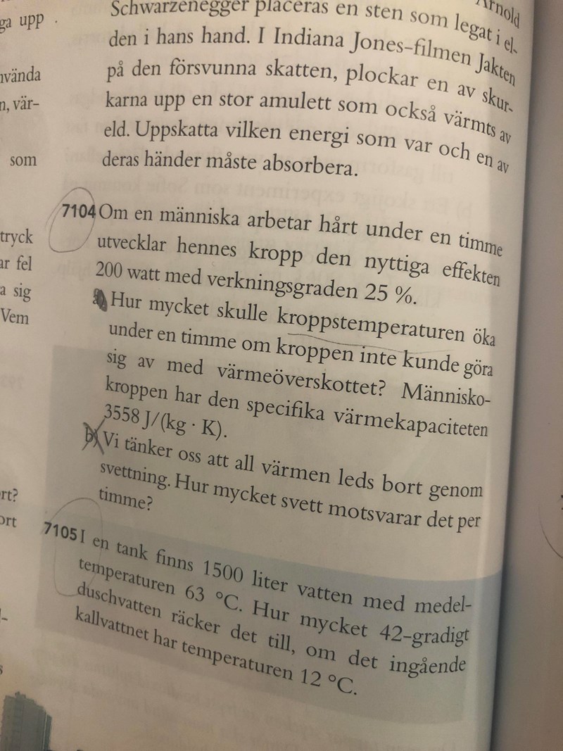 På frågan om kroppstemperaturen, när du fått fram Energin, ska du väl sätta in antingen E(nyttig) eller E(tillförd) i VL, och mc*"delta" T i HL. Hur går det då, blir det rätt enligt facit.