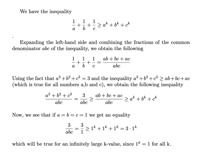 Jag håller med dig. De har visat att om vi begränsar värdena ytterligare till att a=b=c=1 så gäller olikheten alla k men det är sannerligen inte självklart att det gäller alla abc som uppfyller villkoren.