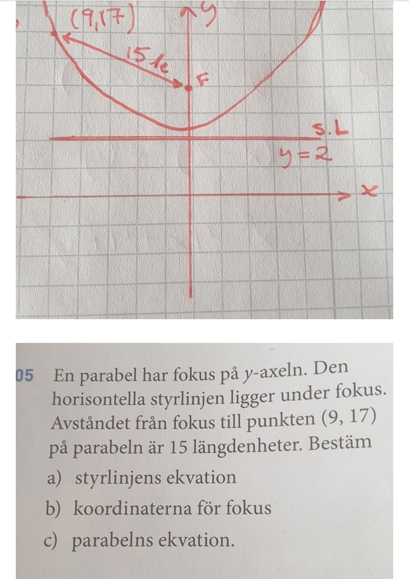Så som uppgiften är formulerad vet man bara x-koordinaten för fokus när man skall svara på a-uppgiften. Då kan man utnyttja att avståndet är 15 längdenheter från punkten (9,17) rakt ner till styrlinjen.