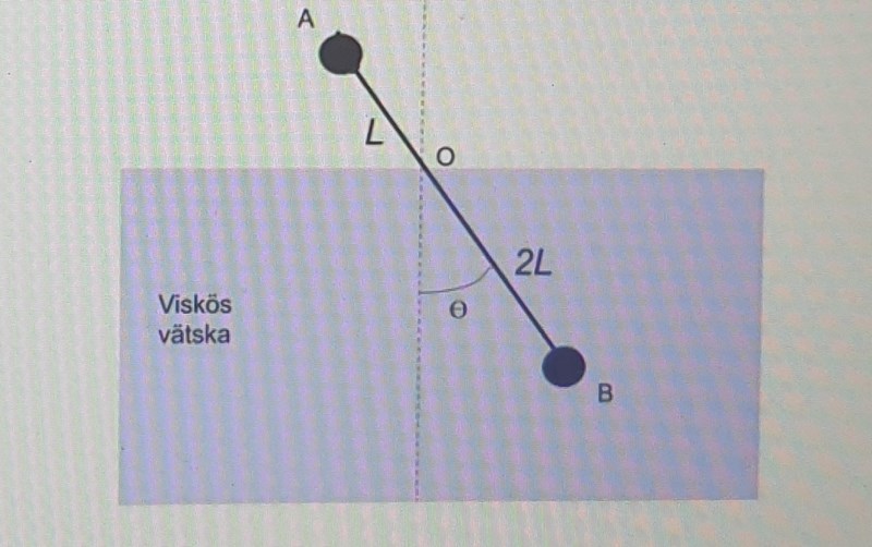 En pendel består av en lätt stång och två kulor med massa mA och mB. pendeln har en längd 3L och svänger kring vertikalen med axel i punkten O. Nedre delen av pendeln är nedsänkt i en viskös vätska. Friktionskraften som vätskan utövar på kula B är motriktad och proportenell mot dess hastighet med proportiomaltetkonstanten c.