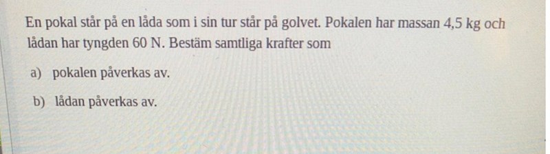 I pokalbilden sätter du ut alla krafter som verkar på pokalen. Tänk på angreppspunkt för krafterna. Alla krafter har en angreppspunkt. I denna bild finns inte lådan med. Den är ersatt med kraften som lådan påverkar pokalen. Det ser ut som att du har fått med allt i din bild men den blir lite grötig (och så är den för liten).