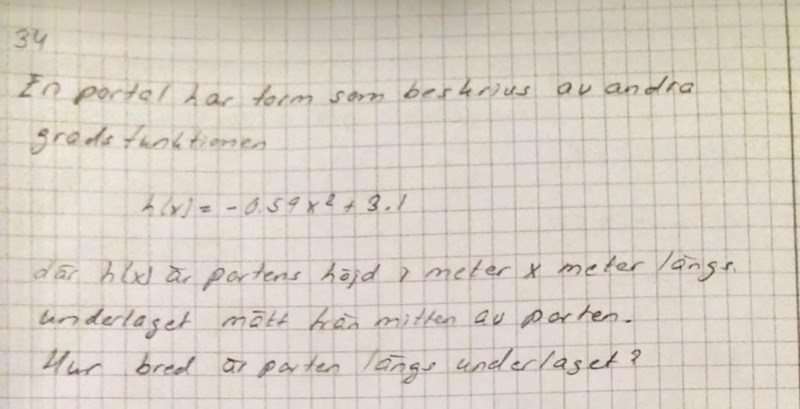 Du skall inte uppskatta portens bredd längst ner, du skall beräkna den. Lös ekvationen h(x)=0.