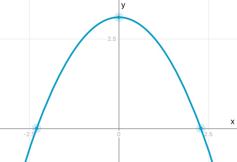 Det finns två lösningar, ungefär 2,3 respektive -2,3 (meter). Avståndet mellan dessa båda punkter är 4,6 meter. Om du tittar på bilden bör du se att kurvan skär x-axeln på två ställen.