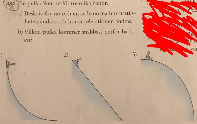 Hur kommer man fram till att 1. kommer snabbast ner? Sluthastigheten är ju samma pga att lägesenergin innan start = rörelseenergin vid mål.