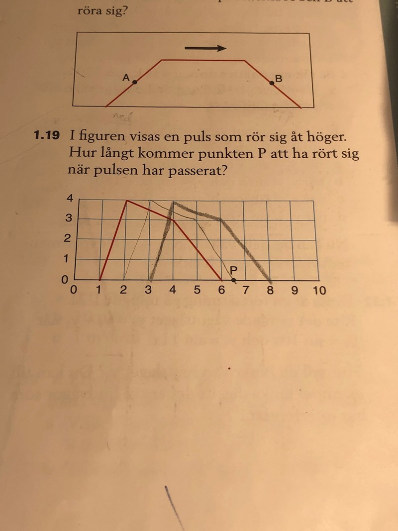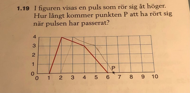 I bilden där det har gått tre sekunder (det står inget om sekunder i uppgiften, men vi kan säga att pulsen rör sig en längdenhet per sekund) och pulsen befinner sig mellan x = 3 och x= 8, så är punkten P på pulsen, dvs. på y = 2.