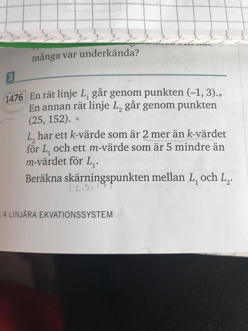 Uppgiften ger oss 4 ekvationer, tack vare de två punkterna och påståendena om k och m. Dessa är: