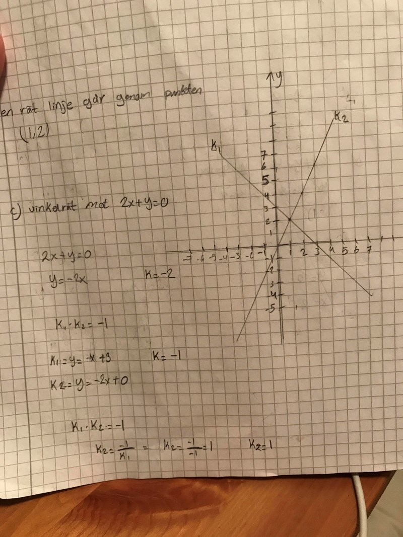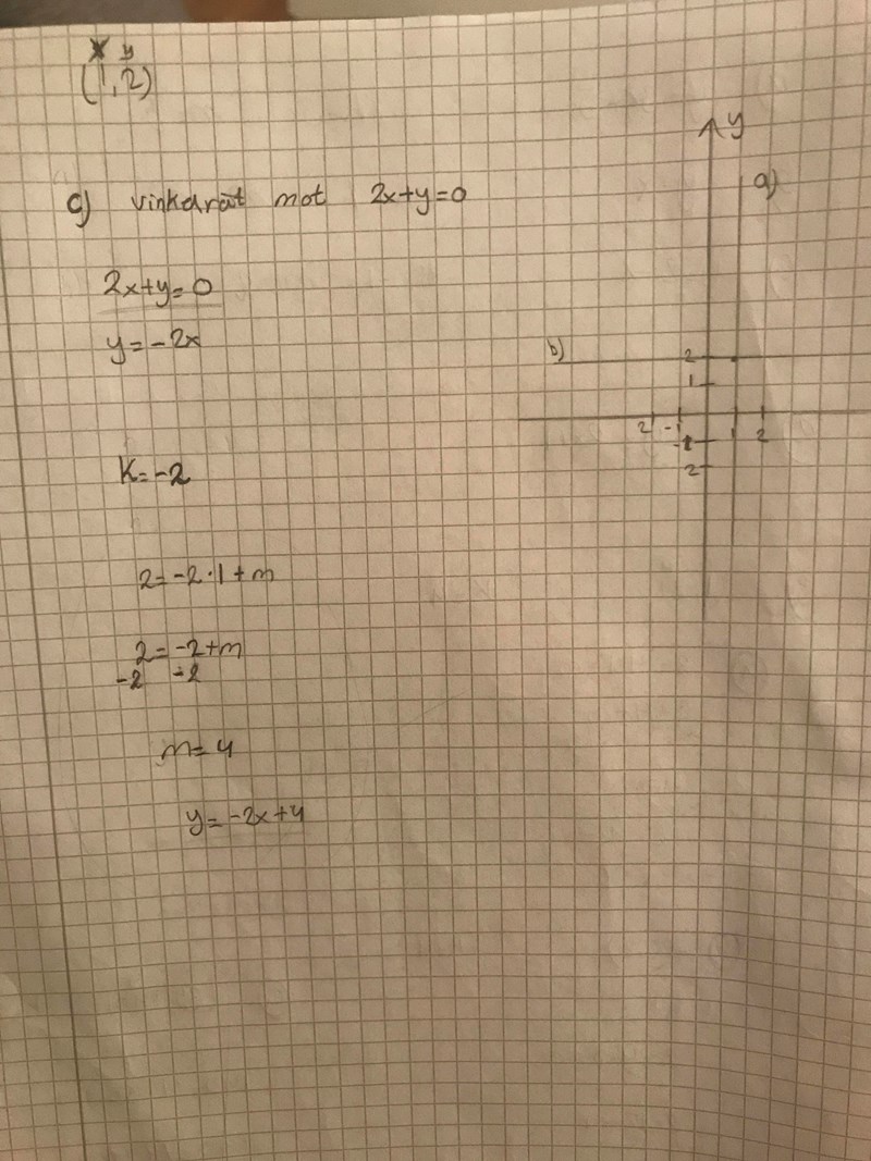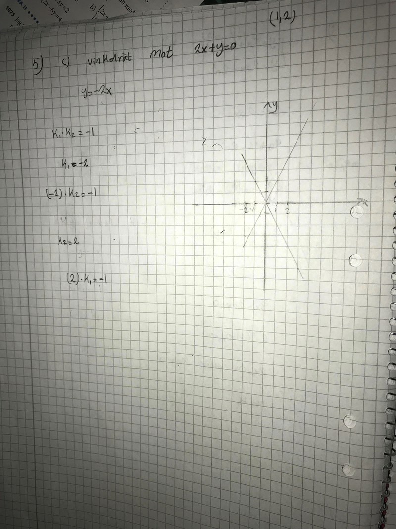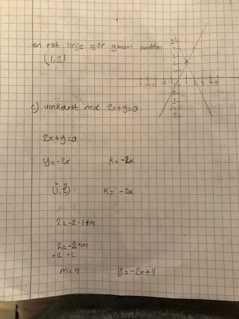 Men det var inte det du skulle göra. Du skulle ta fram ekvationen för en linje som går genom (1, 2) och är vinkelrät mot 2x + y = 0.