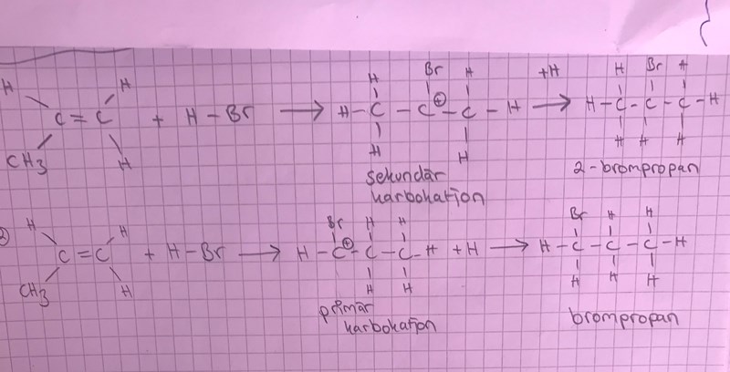Hej, jag ska skriva en reaktion för då 2-propen reagerar med vätebromid. Jag undrar om jag har tänkt rätt?