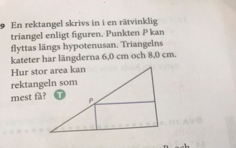 Ritade in triangeln i koordinatsystem, hypotenusan ger då punkterna (-8,0) och (0,6) sen ger y=kx+m , k=0,75.hypotenusans rätalinje : y=0,75x+6