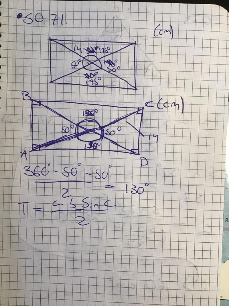 Jag är helt vilse när det kommer till att rita rektangeln. Antar att de två diagonalerna gör som ett kross i rektangeln vilket hade skapat 4 trianglar men kan inte komma på vart en 50° vinkel hade hamnat.