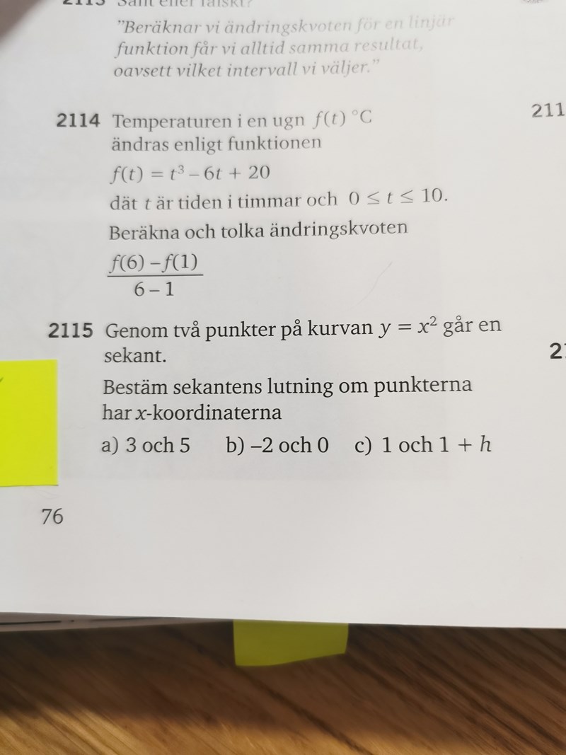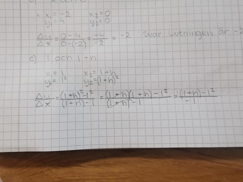 Jag försöker lösa uppgift 2115 c. Jag ska beräkna en sekants lutning om x-koordinaterna är 1 och 1+h.