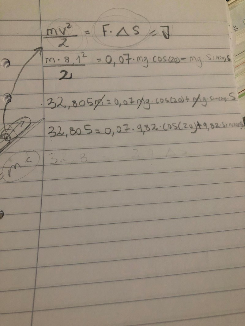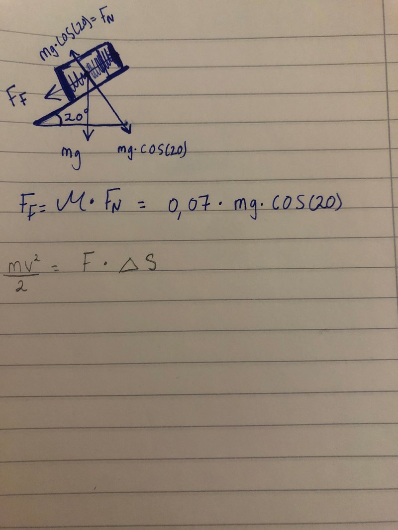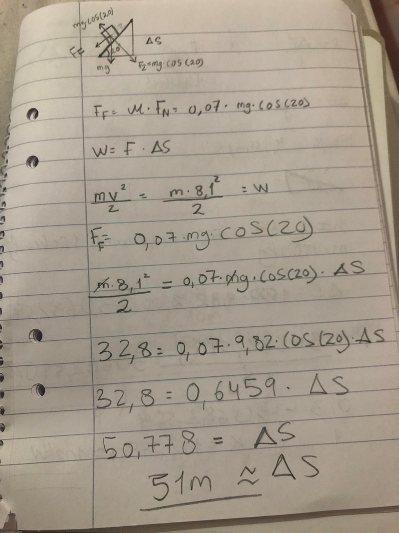 En skidåkare närmar sig en uppförsbacke med lutningsvinkeln 20°. Vid backens början har hon hastigheten 8,1 m/s. Beräknar hur lång sträcka ds, som hon glider uppför backen innan hon stannar. Friktionskoefficienten u mellan sidorna och snön är 0,07.