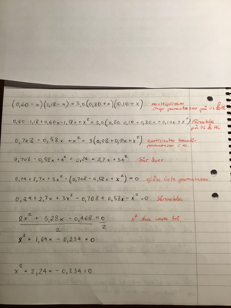 Det blir fel någonstans, jag ser inte vart? I steg fem står det minus framför parentesen, om man tar bort parentesen så byter allt tecken. Men det blir fel, men även om man skulle låta bli att ta bort parentesen så saknas det fortfarande 0,10. Det närmaste svaret jag får är 2,12x men man får inte bara ta bort parentesen.