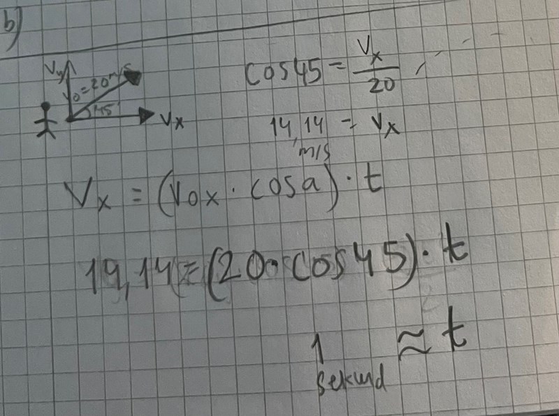 ”En sten kastas i månen, starthastighet = 20 m/s, kastvid = 45 grader, gravitation = 1,62. Beräkna tiden?”