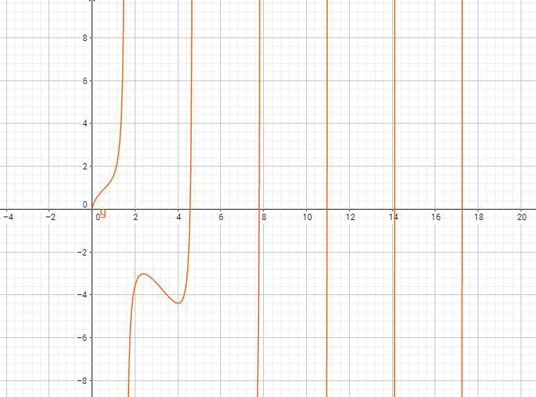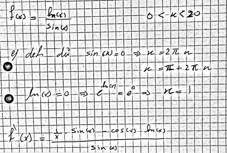 f(x)  =  ln(x) / sin(x)                i intervallet  0<x<20