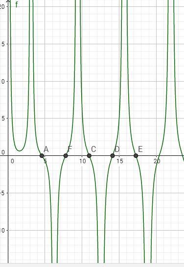 När derivatan är noll så det finner 4 nollställer inom intervallet 0<x<10. Jag har ritat f´(x) i grafritare och har fått det:Stämmer det at A, F, C, D, E är noll ställer inom intervallet 0<x<20, i så fall hur ska jag få vidare ?