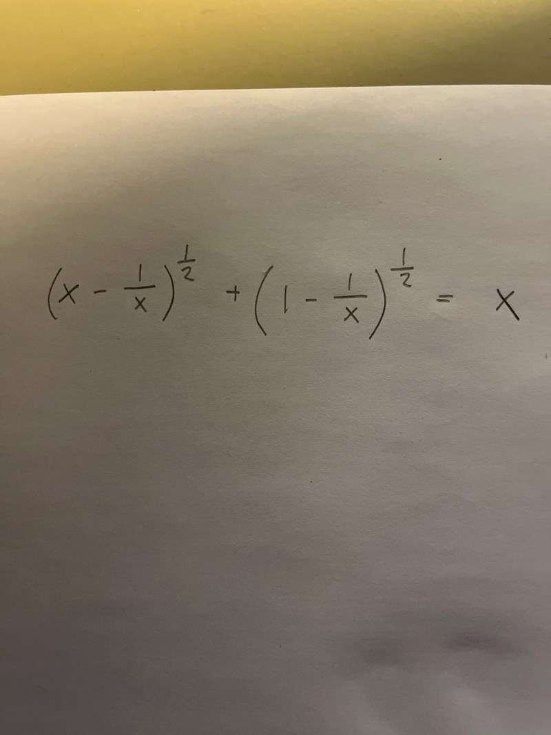 https://www.wolframalpha.com/input?i=%28x-1%2Fx%29%5E%281%2F2%29%2B%281-1%2Fx%29%5E%281%2F2%29%3Dx