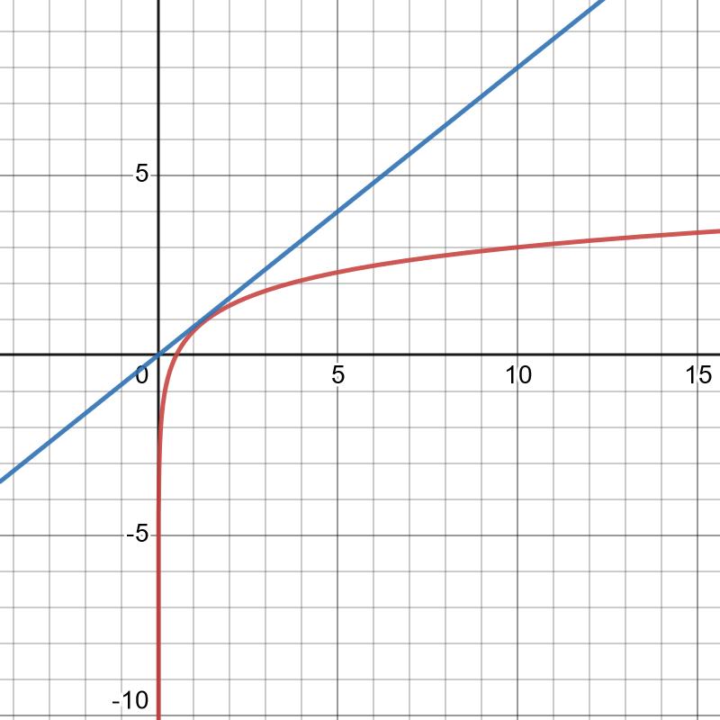 då derivatan av funktionen är 1/x så kan väl tangenten inte gå igenom origo då den för dessa punkter är odefinierad. Eller?