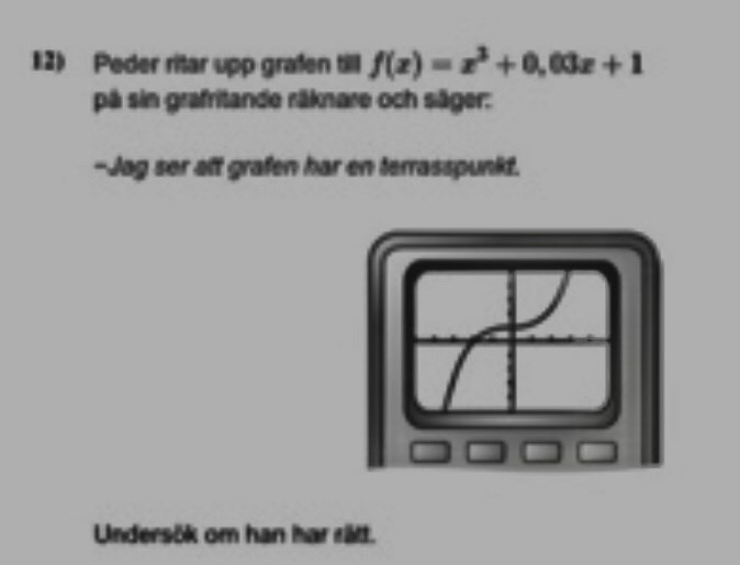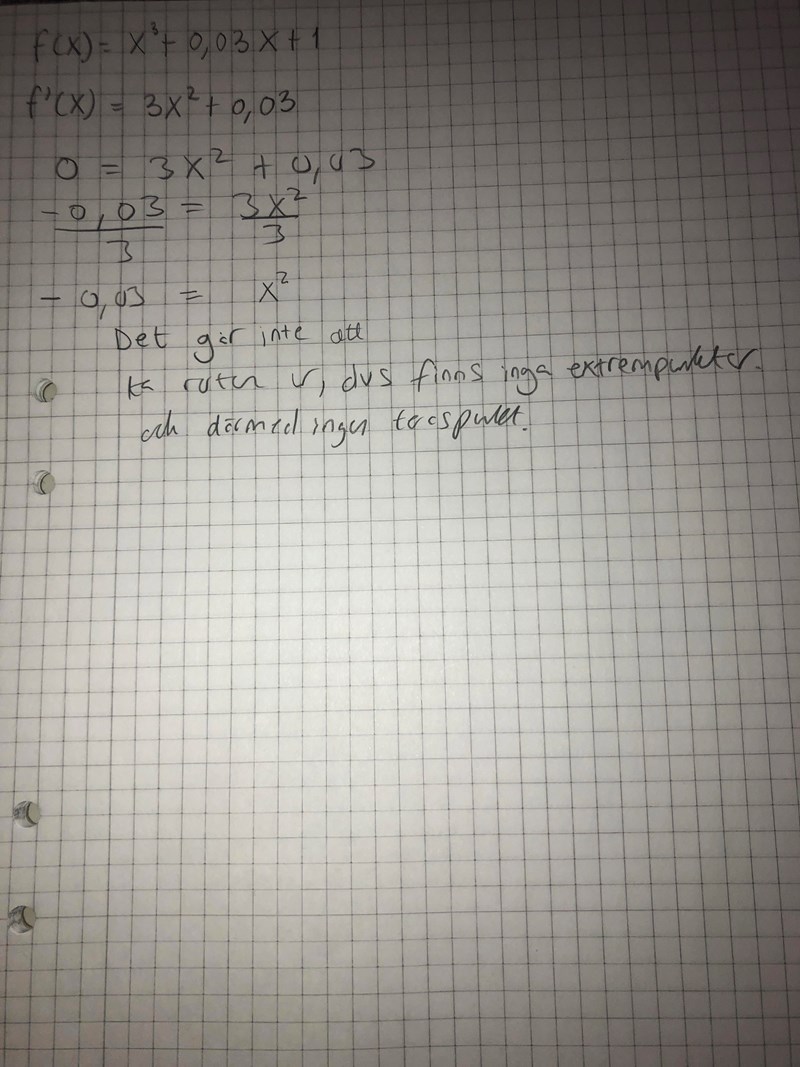 Matematik / Matte 3 1 svar 31 visningar Katarina149 behöver inte mer hjälp Avmarkera Katarina149 7151 Postad: 12 mar 2021 19:53 Redigerad: 12 mar 2021 19:53 En terasspunkt har jag tänkt rätt? Yngve 42408 Postad: 12 mar 2021 20:01 Det stämmer. Användare skriver Svara Du behöver Logga in eller Bli medlem först! Avbryt