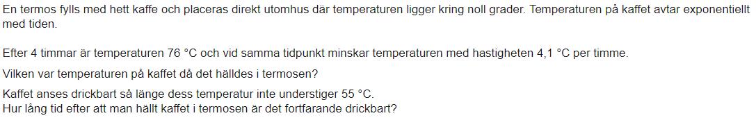 Funktionen skär y-axeln vid y=92, alltså var kaffet 92 grader celsius när den ställdes utanför.