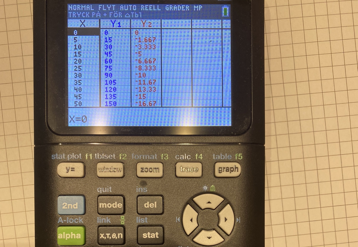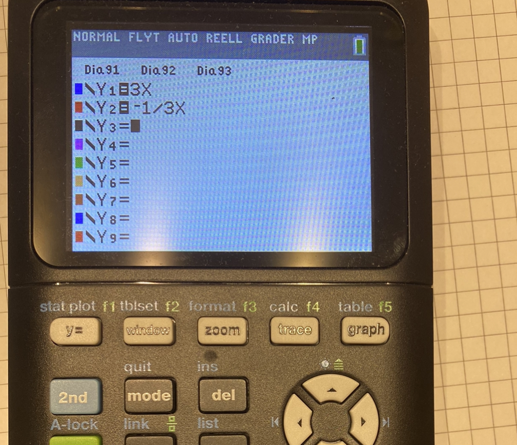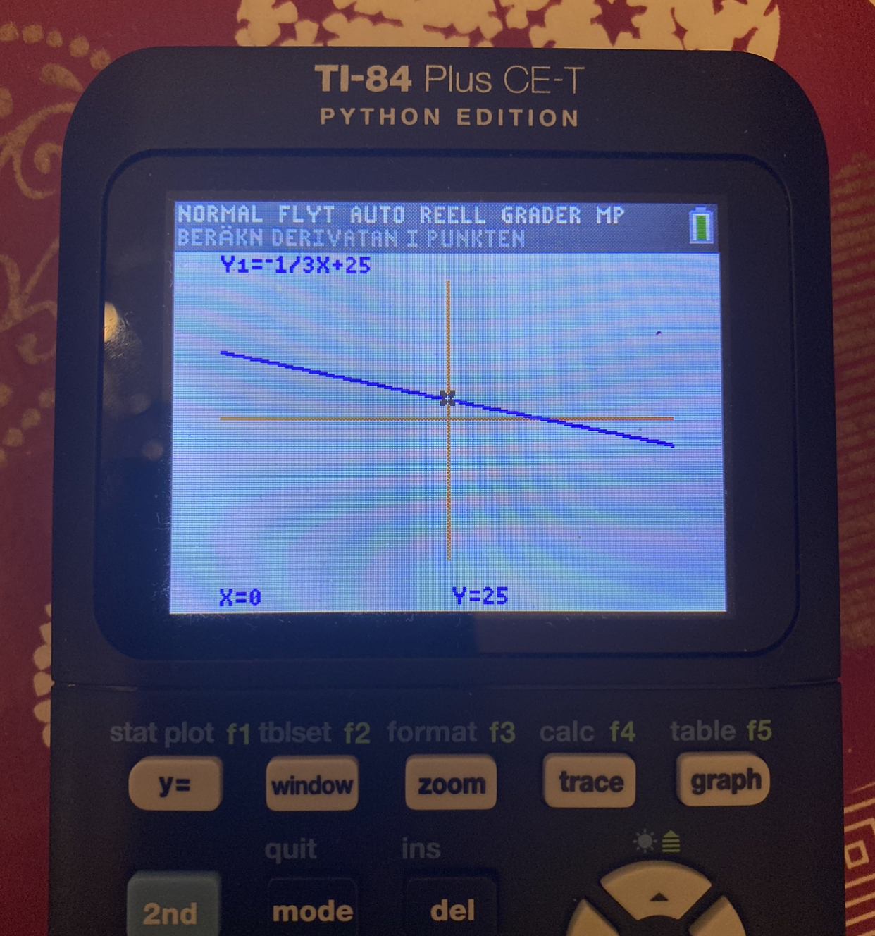 men om jag har ekvationen för den ena som då är y=3x och nu vet jag att den andra blir y=-1/3x och jag knappa in de så kan jag se värdetabell för y= -1/3x och där så går ju linjen inte genom (0,25) så om svaret ska bli sant då gör jag fel någonstans?