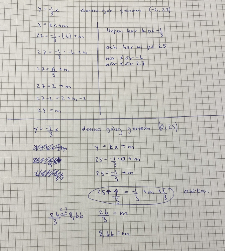 Jag fick då att m alltså skärningen med y axeln blev typ 8,66. Men är osäker på ett steg i den räkningen, jag ringa in den.
