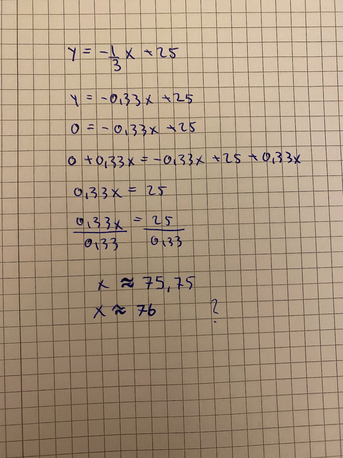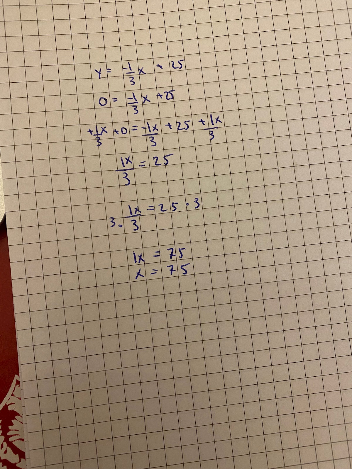 Prova gärna att se om du är trygg att med aritmetik beräkna var denna linje skär x-axeln, alltså sätta y till 0 i y=-x/3+25 och lösa ut x. Ha en fin dag!